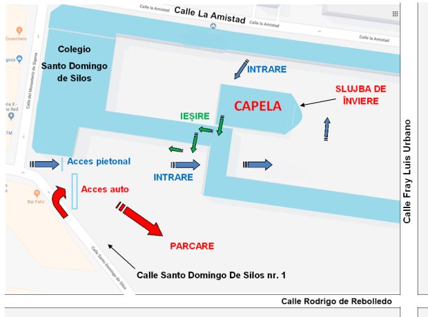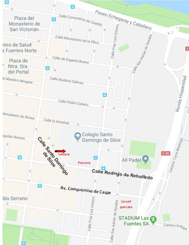 Cu ajutorul Bunului Dumnezeu, anul acesta vom celebra Slujba de Înviere într-un spațiu generos, acoperit, și anume în Capela Colegiului Santo Domingo de Silos, din Calle Amistad nr. 6, cartier Las Fuentes, Zaragoza. Slujba va avea loc sâmbătă, 27 aprilie 2019, începând cu ora 23:00. Mijloace de transport pentru a ajunge la colegiu sunt autobuzele 22, 24, 30 și 44. Locuri de parcare avem chiar în curtea Colegiului, în limita capacității, aprox. 250 locuri, precum și la intersecția străzilor San Adrian de Sasabe și Compromiso de Caspe.