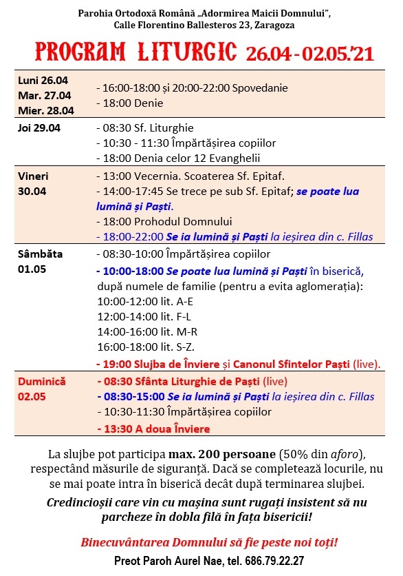 ambele cu aforo max. de 200 pers., vor fi transmise live pe pagina https://www.facebook.com/ParohiaOrtodoxaZaragoza