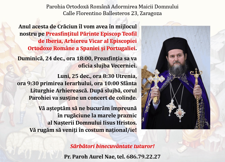 De praznicul Nașterii Domnului, Preasfințitul Părinte Teofil de Iberia, Arhiereu-vicar al Episcopiei Ortodoxe Române a Spaniei și Portugaliei, a slujit Dumnezeiasca Liturghie în Parohia Adormirea Maicii Domnului și Sf. Mc. Vichentie, din Zaragoza, avându-i alături în slujire pe PC Părinte Aurel Nae, vicar administrativ și parohul comunității, și PCuv. Arhid. Casian Nemet.