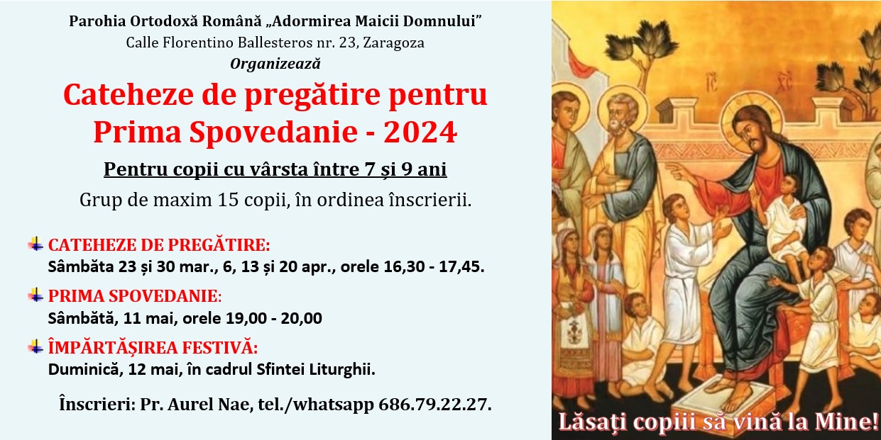 Duminică, 11 feb. 2024, a avut loc în Parohia Zaragoza Taina Sfântului Maslu, la care au slujit Părintele Ștefan Nuțescu, starețul Chiliei Buna Vestire din Sf. Munte Athos, Ierom. Cosma Giosanu, starețul Schitului Sf. Neagoe Voievod Basarab, Vlădești – Argeș, și Ierom. David Gălbează, economul Chiliei Buna Vestire, Sf. Munte Athos. La invitația părintelui paroh Aurel Nae au răspuns și au participat la Sf. Maslu preoții din câteva parohii din Protoieria de Aragon: Huesca, Mallen, Ejea de los Caballeros, Calatayud și Valderrobres. La Sfânta Taină a fost sfințit untdelemn în cantitate mai mare, așa încât credincioșii vor avea posibilitatea să primească și în perioada următoare ulei de la Sfântul Maslu, de la pangarul Parohiei, pentru a-l folosi cu credință pentru sănătatea sufletească și trupească.