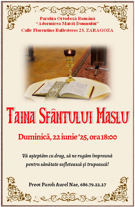 În seara zilei de vineri, 27 iunie, credincioșii Parohiei Ortodoxe „Adormirea Maicii Domnului” din Zaragoza s-au adunat în rugăciune la Slujba Sfântului Maslu, oficiată de Preasfințitul Părinte Teofil de Iberia, Arhiereu Vicar al Episcopiei Ortodoxe Române a Spaniei și Portugaliei. Alături de Preasfinția sa au slujit PC Pr. Paroh Aurel Nae și P Cuv. Ierodiacon Casian Nemeth. Evenimentul a fost unul de profundă încărcătură spirituală, aducând mângâiere și întărire celor prezenți.