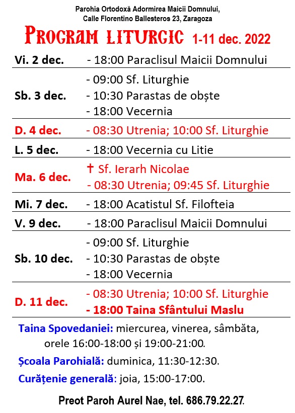 Calle Florentino Ballesteros 23, 50013 Zaragoza. Preot Paroh AUREL NAE, tel. 686.79.22.27