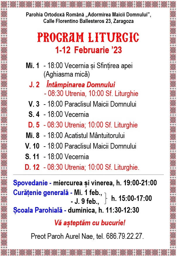 Calle Florentino Ballesteros 23, 50013 Zaragoza. Preot Paroh AUREL NAE, tel. 686.79.22.27