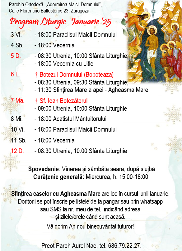 Calle Florentino Ballesteros 23, 50013 Zaragoza. Preot Paroh AUREL NAE, tel. 686.79.22.27