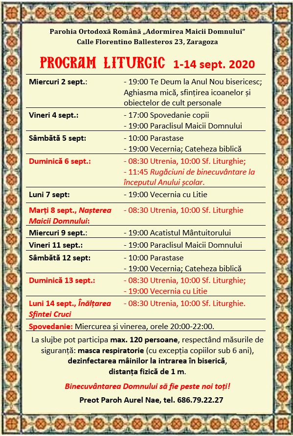 Calle Florentino Ballesteros 23, 50013 Zaragoza. Preot Paroh AUREL NAE, tel. 686.79.22.27
