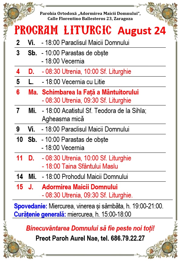 Calle Florentino Ballesteros 23, 50013 Zaragoza. Preot Paroh AUREL NAE, tel. 686.79.22.27