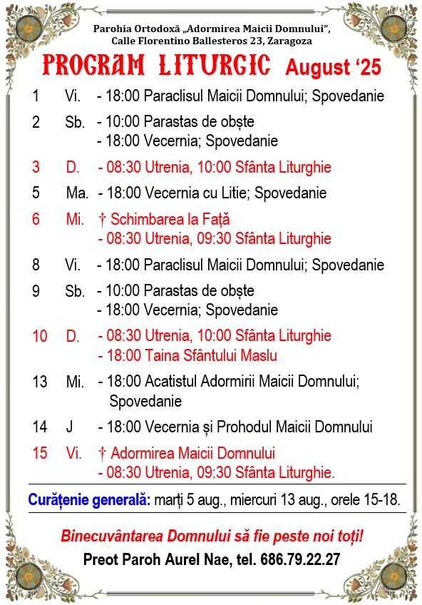 Calle Florentino Ballesteros 23, 50013 Zaragoza. Preot Paroh AUREL NAE, tel. 686.79.22.27