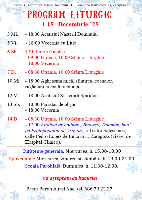 Calle Florentino Ballesteros 23, 50013 Zaragoza. Preot Paroh AUREL NAE, tel. 686.79.22.27
