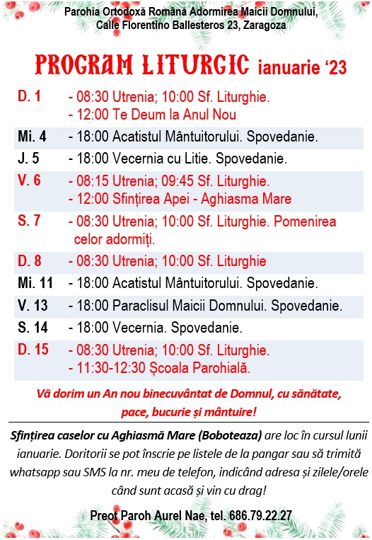 Calle Florentino Ballesteros 23, 50013 Zaragoza. Preot Paroh AUREL NAE, tel. 686.79.22.27