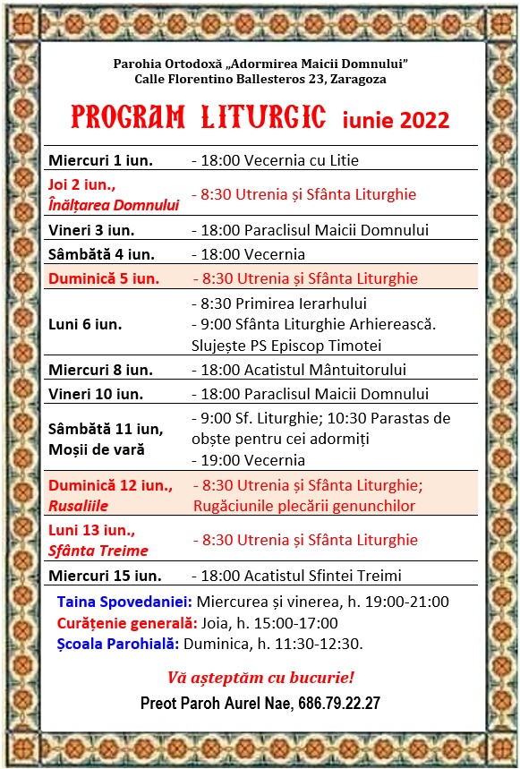 Calle Florentino Ballesteros 23, 50013 Zaragoza. Preot Paroh AUREL NAE, tel. 686.79.22.27