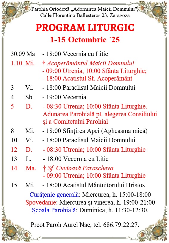 Calle Florentino Ballesteros 23, 50013 Zaragoza. Preot Paroh AUREL NAE, tel. 686.79.22.27