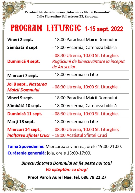 Calle Florentino Ballesteros 23, 50013 Zaragoza. Preot Paroh AUREL NAE, tel. 686.79.22.27