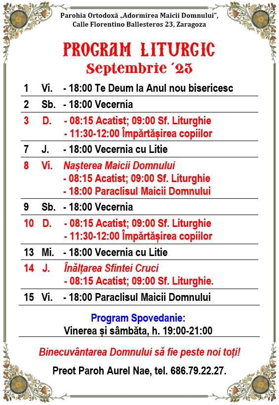Calle Florentino Ballesteros 23, 50013 Zaragoza. Preot Paroh AUREL NAE, tel. 686.79.22.27