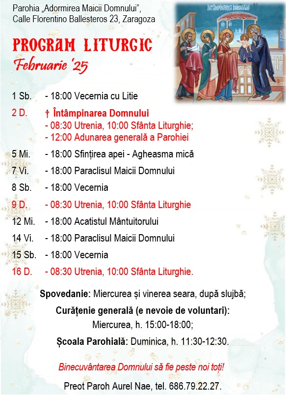 Calle Florentino Ballesteros 23, 50013 Zaragoza. Preot Paroh AUREL NAE, tel. 686.79.22.27