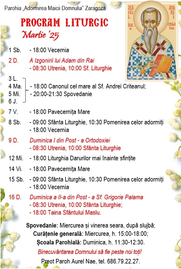 Calle Florentino Ballesteros 23, 50013 Zaragoza. Preot Paroh AUREL NAE, tel. 686.79.22.27