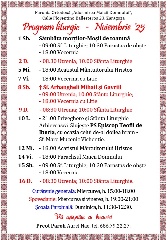 Calle Florentino Ballesteros 23, 50013 Zaragoza. Preot Paroh AUREL NAE, tel. 686.79.22.27