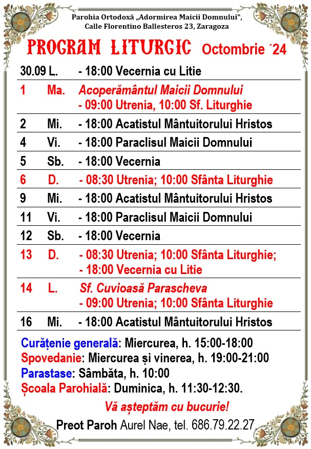 Calle Florentino Ballesteros 23, 50013 Zaragoza. Preot Paroh AUREL NAE, tel. 686.79.22.27