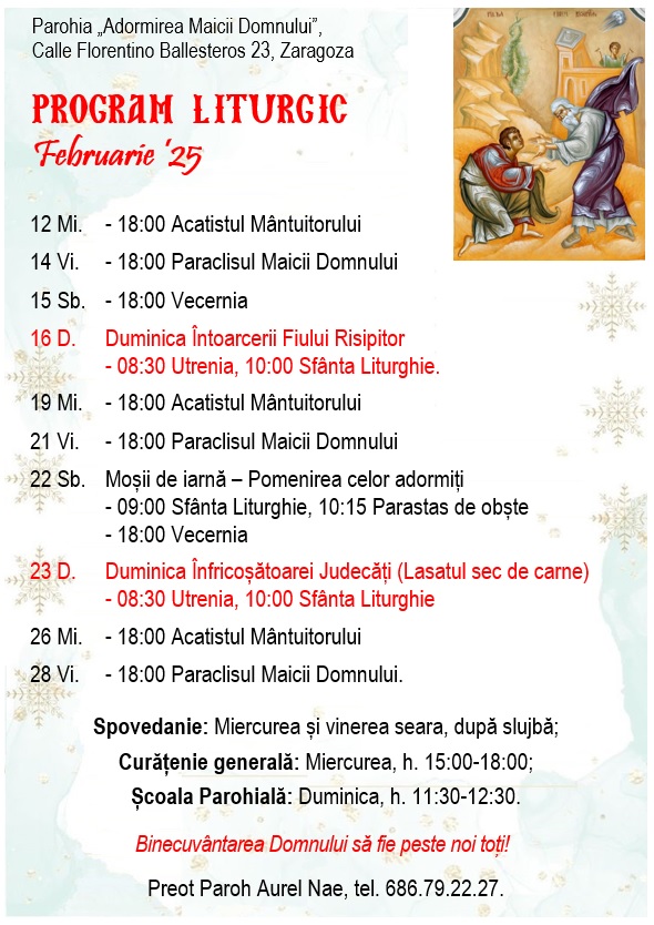 Calle Florentino Ballesteros 23, 50013 Zaragoza. Preot Paroh AUREL NAE, tel. 686.79.22.27