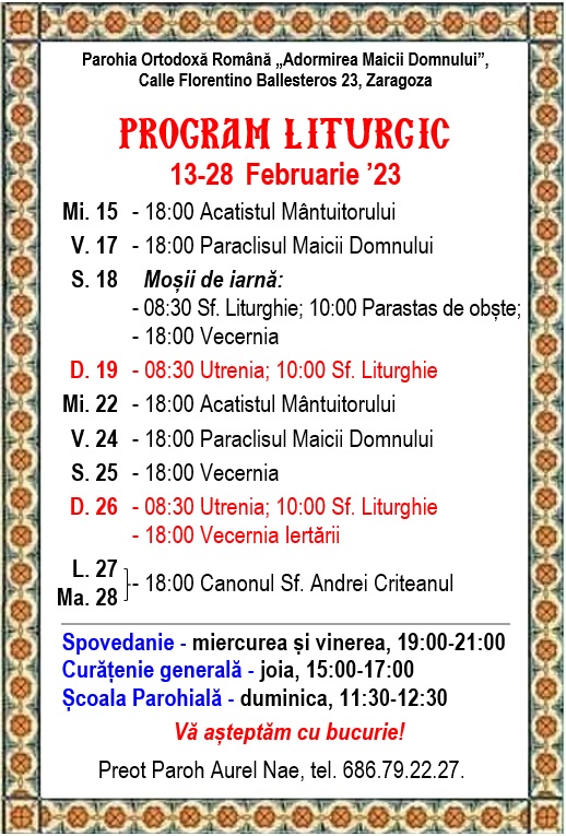 Calle Florentino Ballesteros 23, 50013 Zaragoza. Preot Paroh AUREL NAE, tel. 686.79.22.27