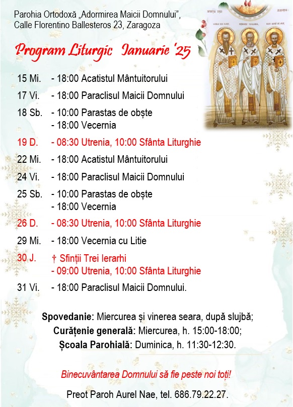 Calle Florentino Ballesteros 23, 50013 Zaragoza. Preot Paroh AUREL NAE, tel. 686.79.22.27