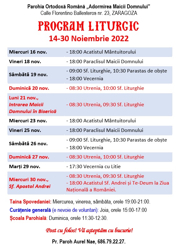 Calle Florentino Ballesteros 23, 50013 Zaragoza. Preot Paroh AUREL NAE, tel. 686.79.22.27