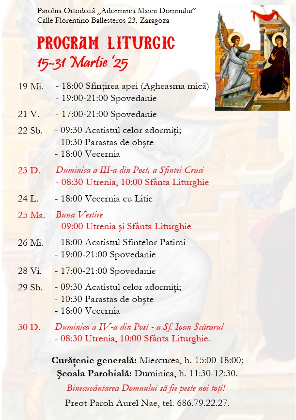 Calle Florentino Ballesteros 23, 50013 Zaragoza. Preot Paroh AUREL NAE, tel. 686.79.22.27