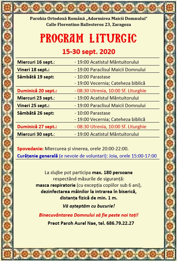 Calle Florentino Ballesteros 23, 50013 Zaragoza. Preot Paroh AUREL NAE, tel. 686.79.22.27