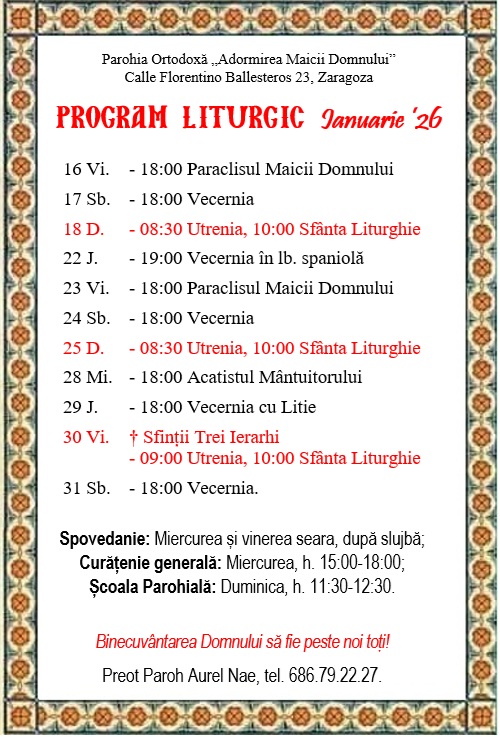 Calle Florentino Ballesteros 23, 50013 Zaragoza. Preot Paroh AUREL NAE, tel. 686.79.22.27