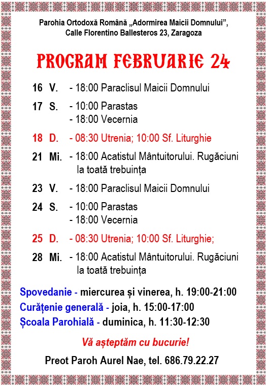 Calle Florentino Ballesteros 23, 50013 Zaragoza. Preot Paroh AUREL NAE, tel. 686.79.22.27