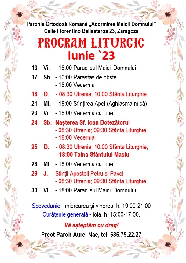Calle Florentino Ballesteros 23, 50013 Zaragoza. Preot Paroh AUREL NAE, tel. 686.79.22.27