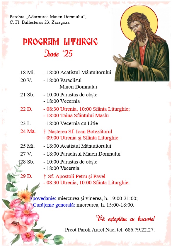 Calle Florentino Ballesteros 23, 50013 Zaragoza. Preot Paroh AUREL NAE, tel. 686.79.22.27