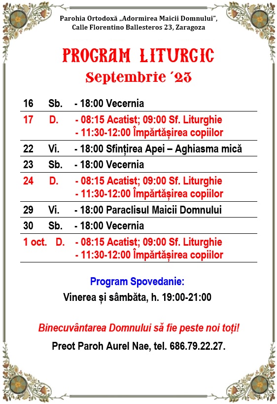 Calle Florentino Ballesteros 23, 50013 Zaragoza. Preot Paroh AUREL NAE, tel. 686.79.22.27