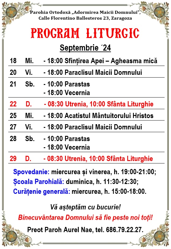 Calle Florentino Ballesteros 23, 50013 Zaragoza. Preot Paroh AUREL NAE, tel. 686.79.22.27
