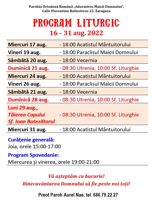 Calle Florentino Ballesteros 23, 50013 Zaragoza. Preot Paroh AUREL NAE, tel. 686.79.22.27