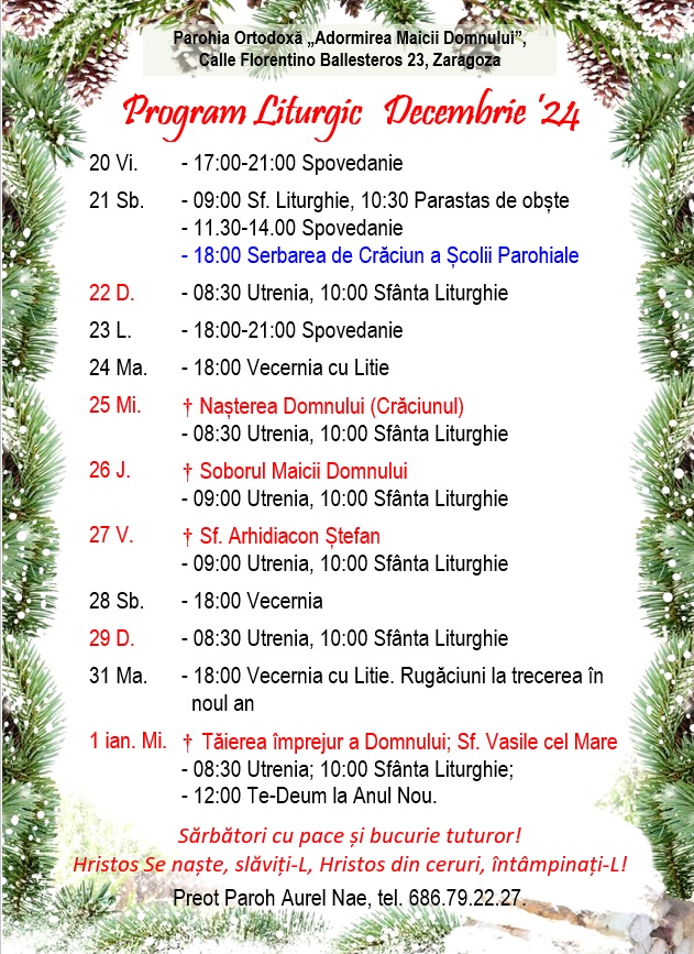 Calle Florentino Ballesteros 23, 50013 Zaragoza. Preot Paroh AUREL NAE, tel. 686.79.22.27