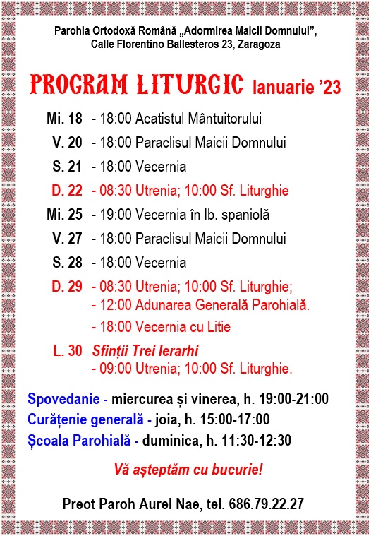 Calle Florentino Ballesteros 23, 50013 Zaragoza. Preot Paroh AUREL NAE, tel. 686.79.22.27