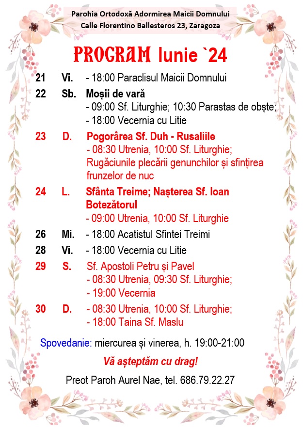 Calle Florentino Ballesteros 23, 50013 Zaragoza. Preot Paroh AUREL NAE, tel. 686.79.22.27