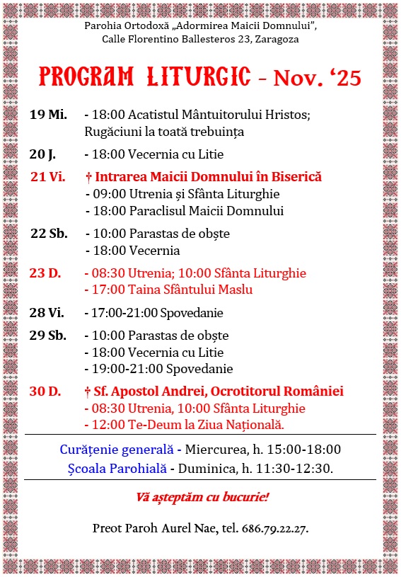 Calle Florentino Ballesteros 23, 50013 Zaragoza. Preot Paroh AUREL NAE, tel. 686.79.22.27