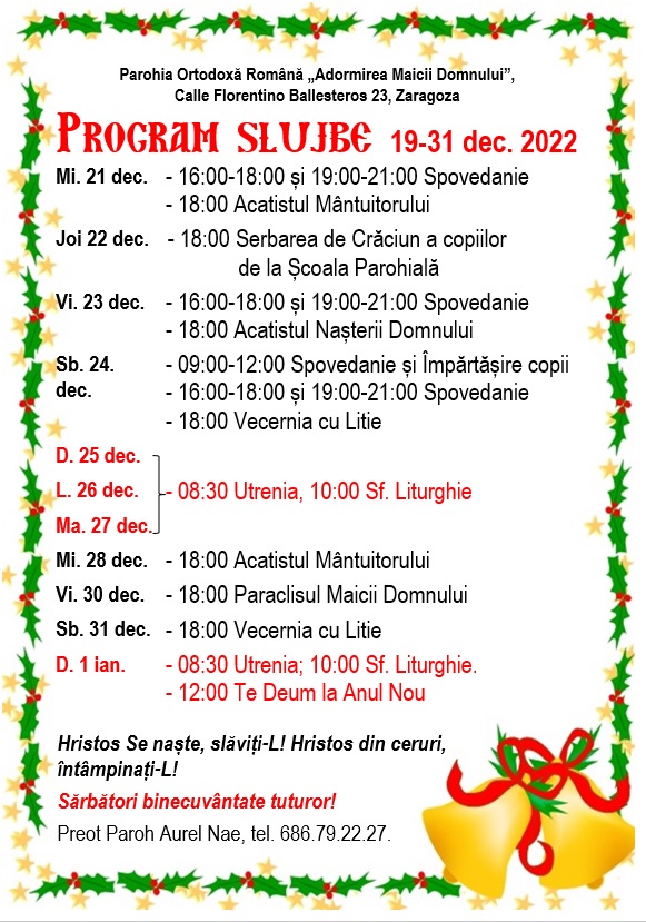 Calle Florentino Ballesteros 23, 50013 Zaragoza. Preot Paroh AUREL NAE, tel. 686.79.22.27