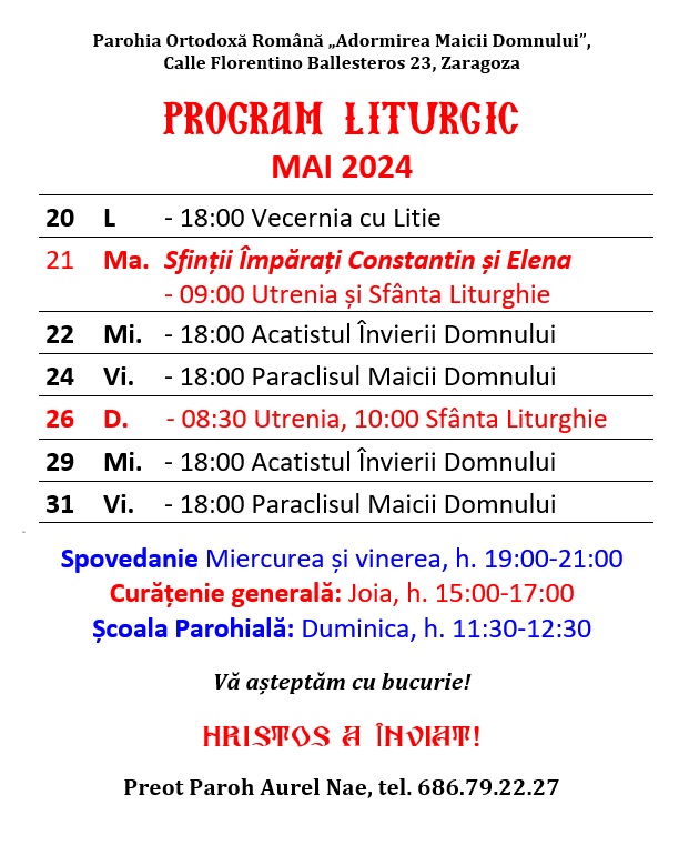 Calle Florentino Ballesteros 23, 50013 Zaragoza. Preot Paroh AUREL NAE, tel. 686.79.22.27