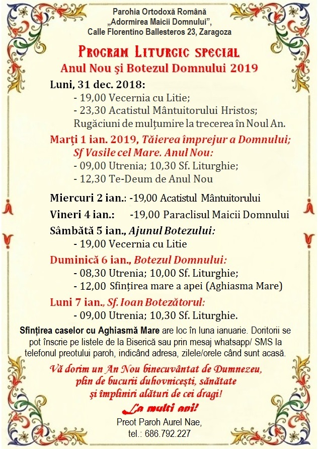 Calle Florentino Ballesteros 23, 50013 Zaragoza. Preot Paroh AUREL NAE, tel. 686.79.22.27