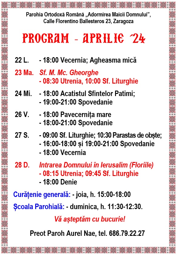 Calle Florentino Ballesteros 23, 50013 Zaragoza. Preot Paroh AUREL NAE, tel. 686.79.22.27