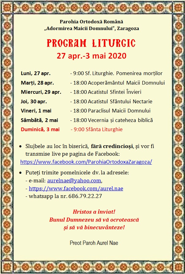 Calle Florentino Ballesteros 23, 50013 Zaragoza. Preot Paroh AUREL NAE, tel. 686.79.22.27