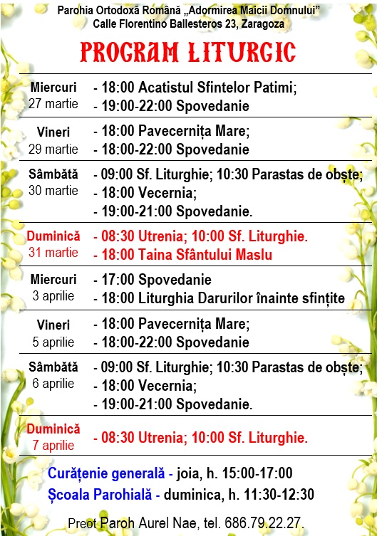 Calle Florentino Ballesteros 23, 50013 Zaragoza. Preot Paroh AUREL NAE, tel. 686.79.22.27
