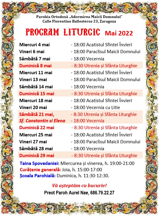 Calle Florentino Ballesteros 23, 50013 Zaragoza. Preot Paroh AUREL NAE, tel. 686.79.22.27