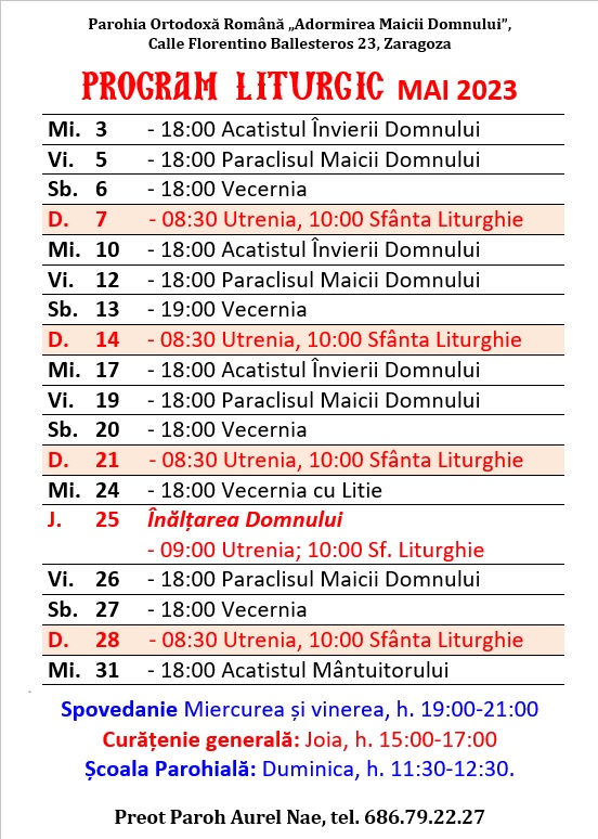Calle Florentino Ballesteros 23, 50013 Zaragoza. Preot Paroh AUREL NAE, tel. 686.79.22.27