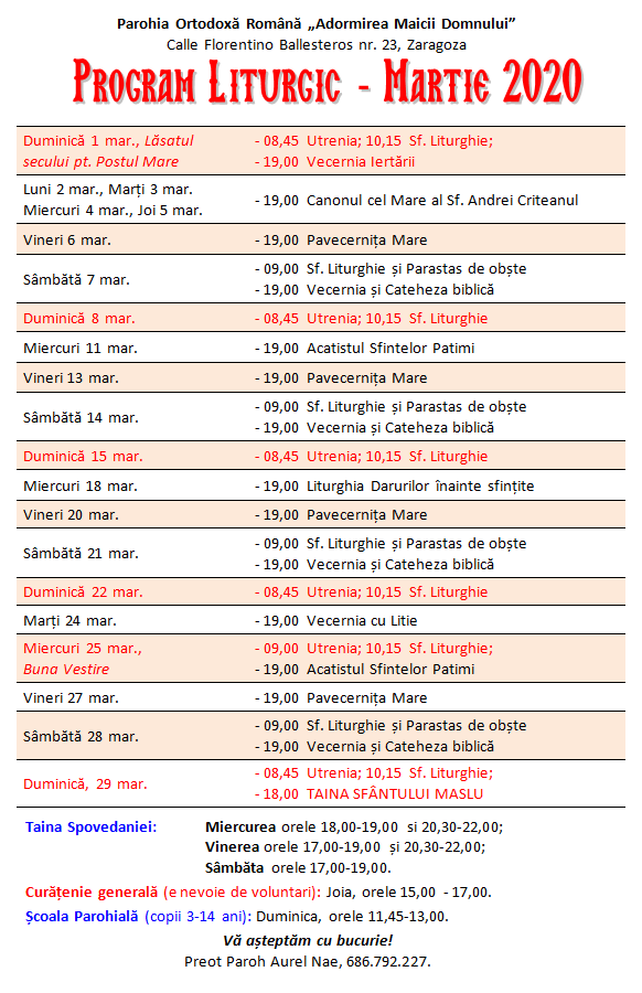 Calle Florentino Ballesteros 23, 50013 Zaragoza. Preot Paroh AUREL NAE, tel. 686.79.22.27