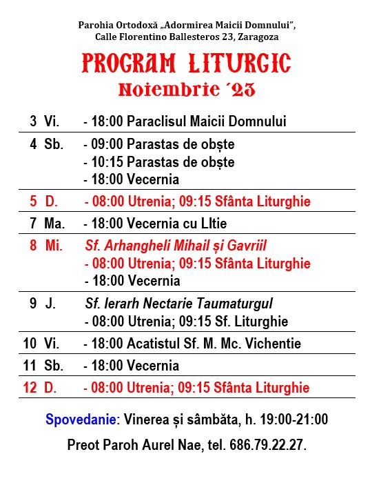Calle Florentino Ballesteros 23, 50013 Zaragoza. Preot Paroh AUREL NAE, tel. 686.79.22.27