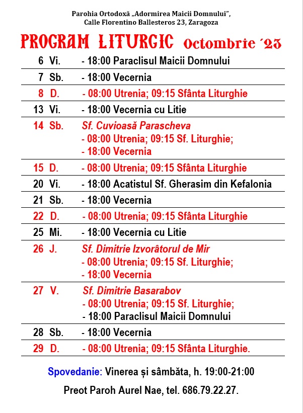 Calle Florentino Ballesteros 23, 50013 Zaragoza. Preot Paroh AUREL NAE, tel. 686.79.22.27