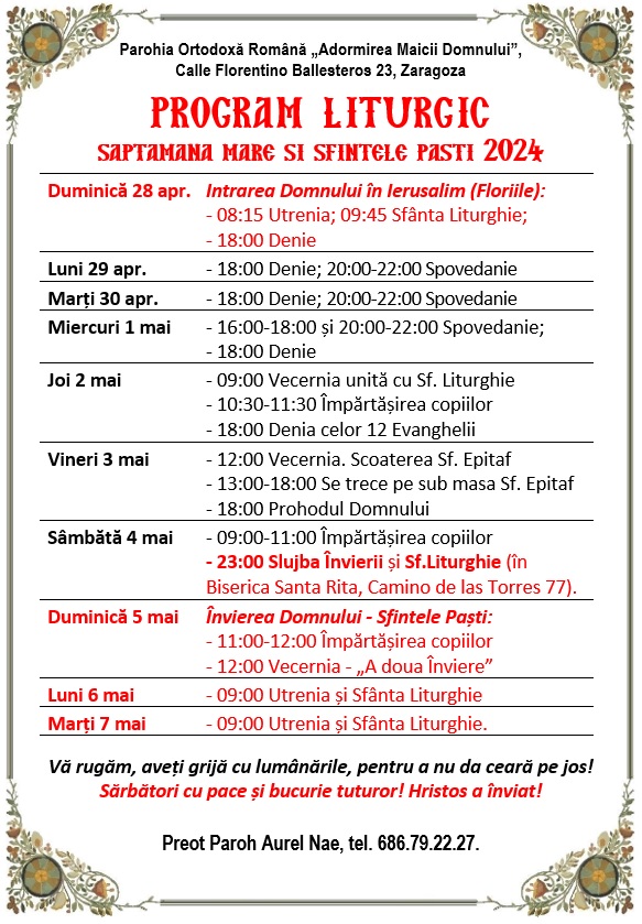 Calle Florentino Ballesteros 23, 50013 Zaragoza. Preot Paroh AUREL NAE, tel. 686.79.22.27